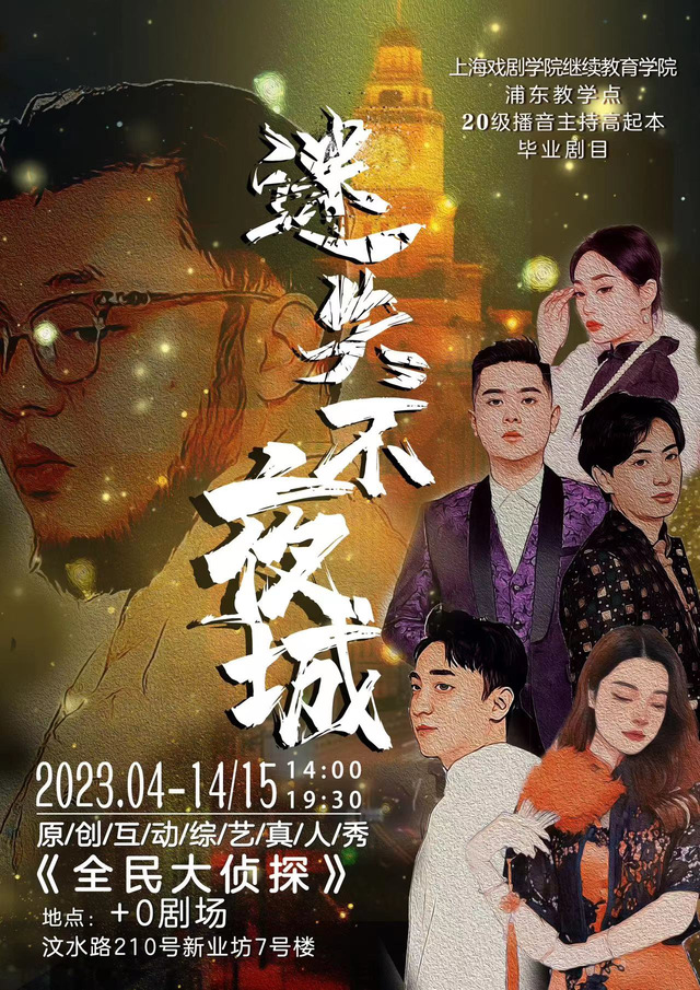 《迷失不夜城》作为20级播音主持高起本的毕业剧目,由教师江曙斐、耿帅和同学们集体创作,打造出原创互动综艺真人秀“全民大侦探”,该剧将于414日—1514:00/19:30上演于+0剧场(汶水路210号新业坊7号楼)。